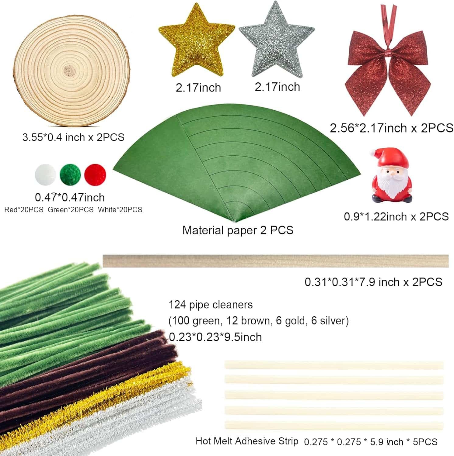 - Complete Handmade Christmas Ornaments Set Kit: Craft two charming mini Christmas trees with everything included: 124 pipe cleaners (100 green, 12 brown, 6 gold, 6 silver), 2 wooden bases & trunks, 60 pom poms, 2 fairy light strings, 2 tree topper stars, 2 Santa figurines, 5 glue sticks, 2 green cardstock sheets, and easy instructions. Perfect ,handmade christmas ornaments set kit for crafting success